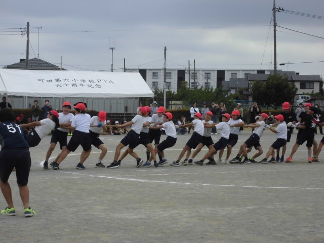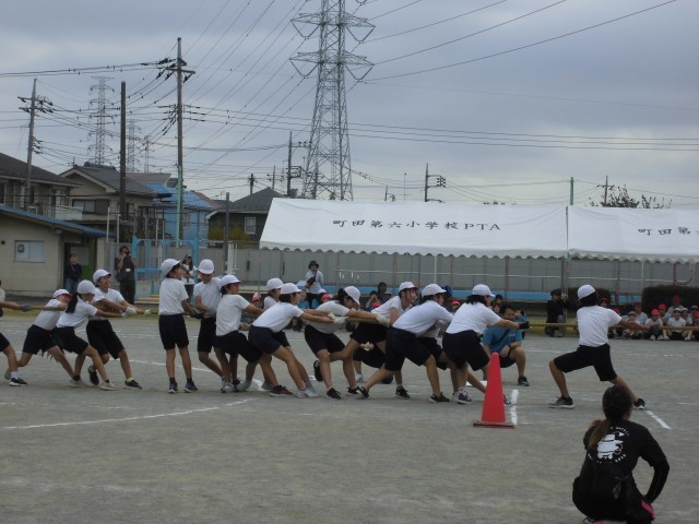 17日(木)6年生は連合体育大会に参加しました。次は、もう一つの選択種目、綱引きです。軍手を付けて2回実施しました。2回目は赤白の場所を入れ替えました。綱を引く姿に迫力がありました。