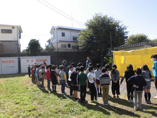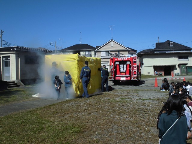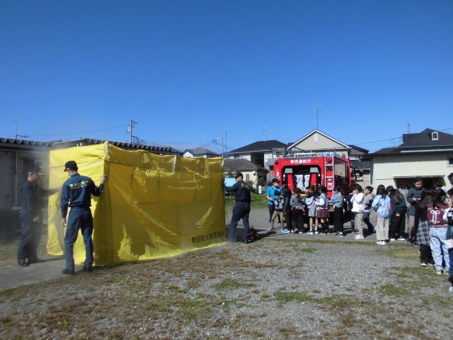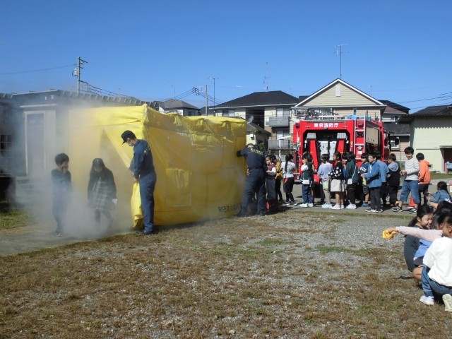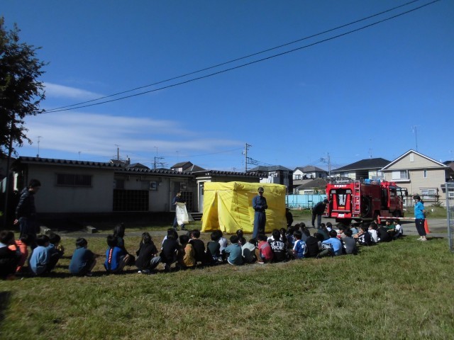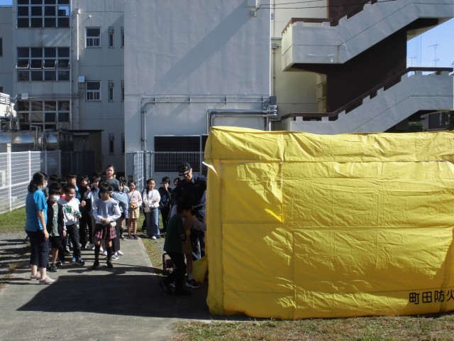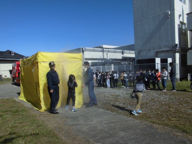 21日(月)3時間目、3年生は煙体験をしました。子どもたちは2人ずつテントの中に入り、煙の中を壁伝いに歩いて出口に向かいました。今回は体に害のない煙を使用しての体験でしたが、子どもたちはハンカチで鼻や口の回りを覆ったり、袖で防いだりすることができました。