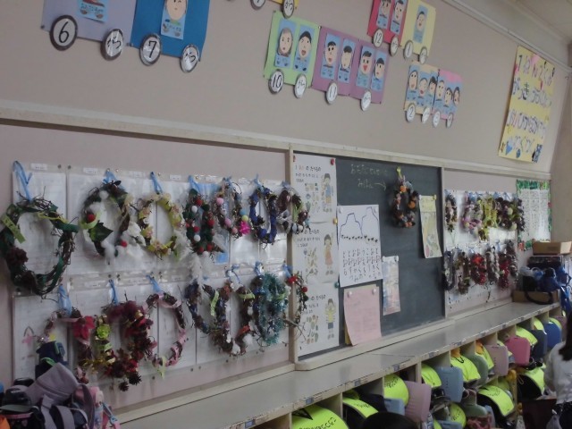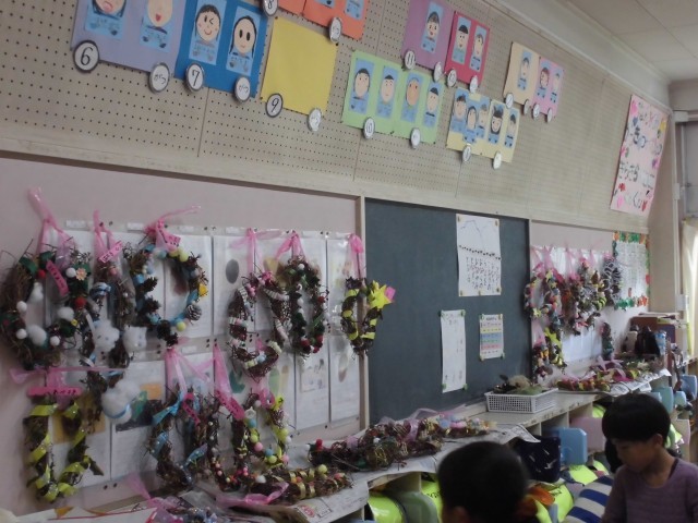 1年生の教室には、生活科の学習で作った「リース」を飾りました。アサガオのつるを丸め、そこに思い思いの飾りをつけたもので、とてもかわいらしい作品に仕上がりました。