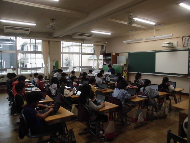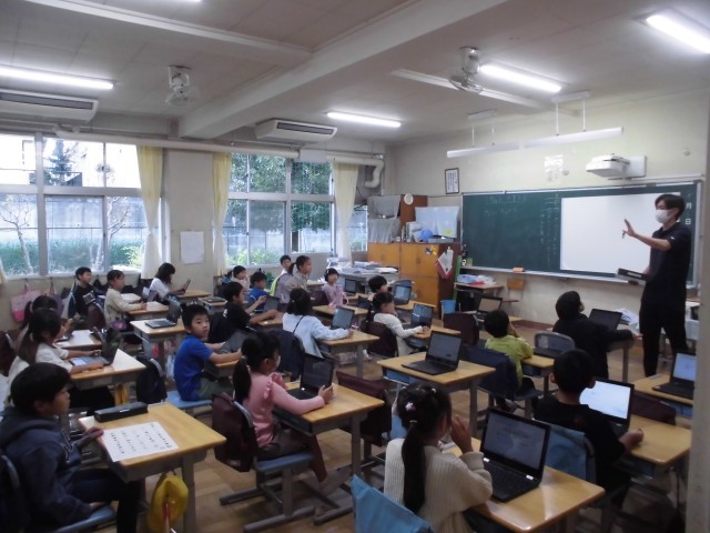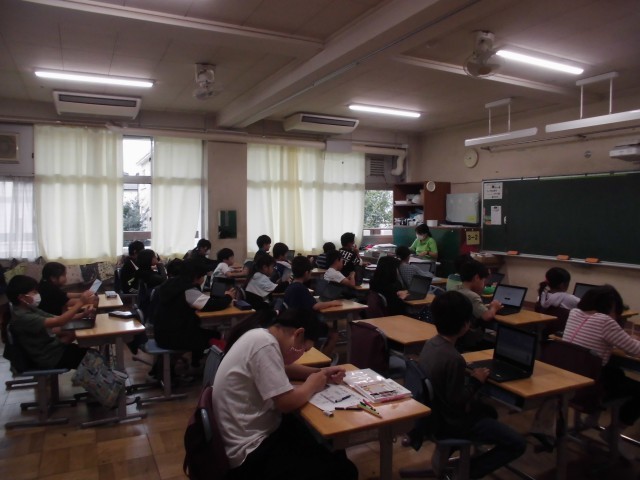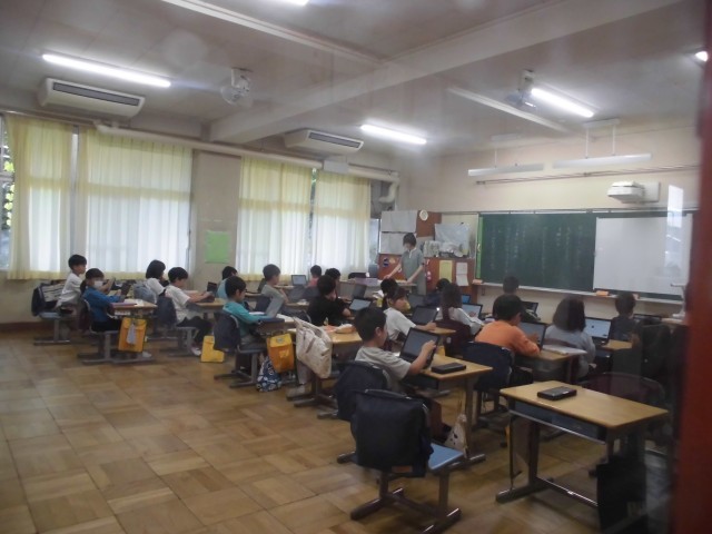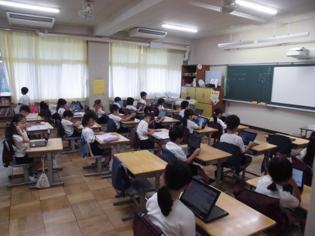 1年生から3年生までの水曜日の朝は、学習用ドリルソフトに取り組みます。ランドセルを片付けるとタブレット端末を机に置いて操作を始めます。子どもたちは各問題に真剣に取り組んでいました。