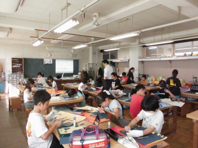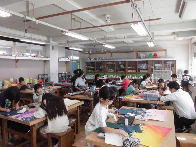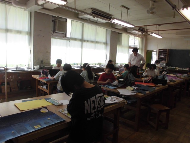 24日(木)1・2時間目、4年2組は図画工作の時間でした。「グラデーションのまち」と題して制作しています。前回までに色付けたグラデーションの背景に、まちのシルエットを作りました。紺色の画用紙を使い、家やビルなどを作りました。カッターでそれぞれに窓を開け、黄色い画用紙で明かりを表現しています。細かい作業も根気よく行っていました。