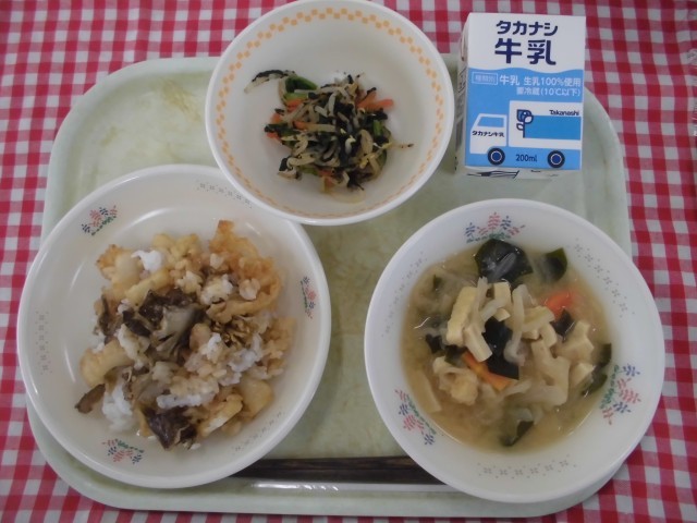 28日(月)の献立は、いかとまいたけのばら天丼、のり酢あえ、乾物みそ汁、牛乳です。