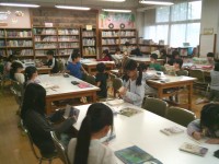 13日(水)の3・4時間目、4年2組は図画工作の時間でした。「ジャングルの生命」と題して、前回までに塗ったジャングルの背景に木や動物の絵を描いていました。青い鳥がいたり、チョウが飛んだりしていました。