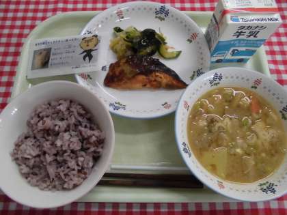 古代米ご飯 やきのリ ますの照り焼き わかめ入りサラダ ごまだれ汁