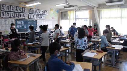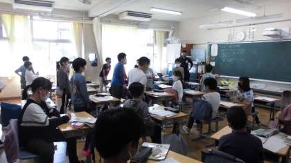 4日(木)の5・6時間目、4年1組は理科の時間でした。「秋と生き物」の学習です。最初に、秋になって変わったことを一人一つずつ全員が発表しました。廊下側の人から始まり、言われてしまったことでもいいので、自分の思ったことを伝えました。「寒くなってきた。」「虫が少なくなった。」「夕方すぐに暗くなる。」「葉が色付いてきた。」など、自分の感じる秋を話すことができました。