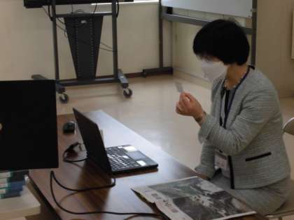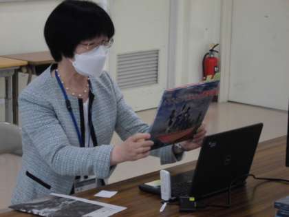 18日(月)の朝会の様子です。企画委員の挨拶に続いて、校長先生の話がありました。今回は2つあり、1つ目は人文字デザインのこと、2つ目は通学路のことです。通学路については、世界の通学路の本を示しながら話をしました。