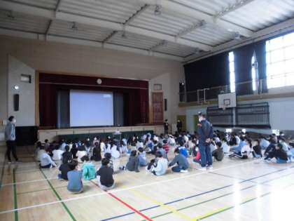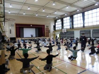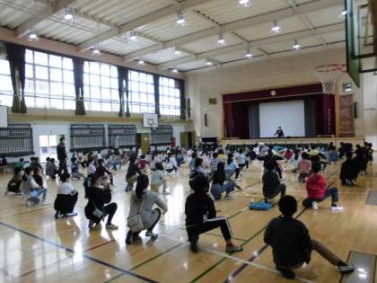 18日(月)の1時間目、3年生と4年生は体育館にいました。運動会で団体演技を一緒に行うため、4年生の先生からめあてや踊りについての話がありました。子供たちは「エイサー」に挑戦します。最後に、少しだけポーズの練習をして終わりました。