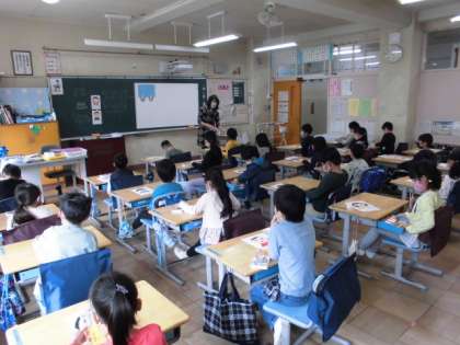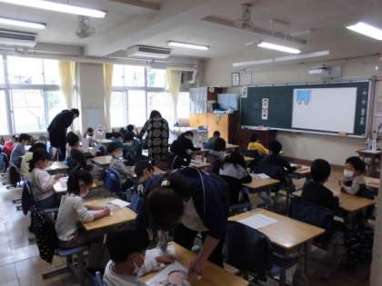 18日(月)の1・2時間目、1年2組も図画工作の時間でした。自分の顔を思い浮かべながら、描きました。耳が見える人と隠れている人とは違えて描きました。1年生の図画工作には、講師の先生も指導します。
