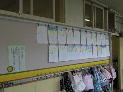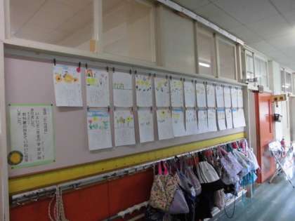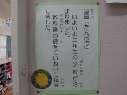 2年生の廊下には、国語の時間に視写した「たんぽぽ」の詩が掲示してあります。文字も絵も上手にかいています。