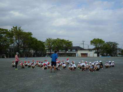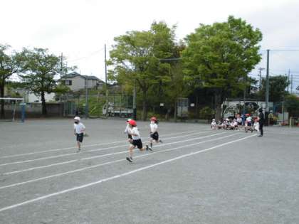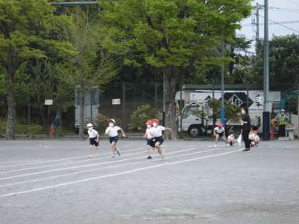 19日(火)の5時間目、2年生は合同で体育の時間でした。校庭で50m走のタイムを測りました。ゴールまで力いっぱい走りました。