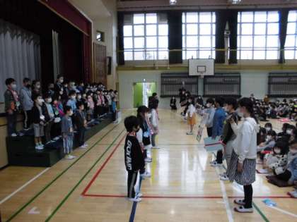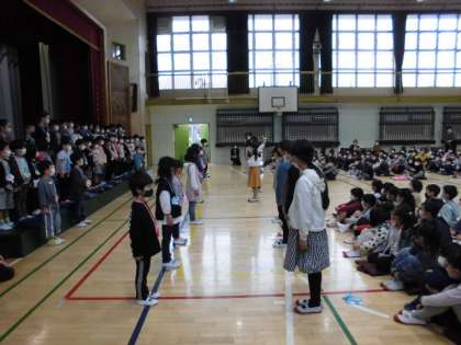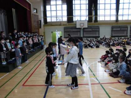 1年生を迎える会では、2年生以上の子供たちからプレゼント渡しがありました。2年生は「遊びパスポート」、3年生は「校歌の掲示物」、4年生は「校庭遊びの紹介図」、5年生は「メダル」、6年生は「校歌の録音CD」をそれぞれプレゼントしました。