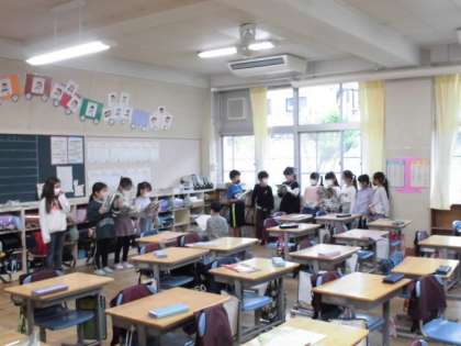 20日(水)の3時間目、2年1組は国語の時間でした。「ふきのとう」の音読発表会前日とあって、グループごとに練習をしていました。