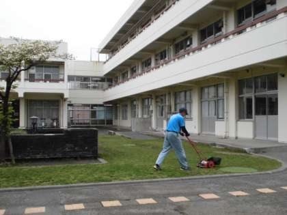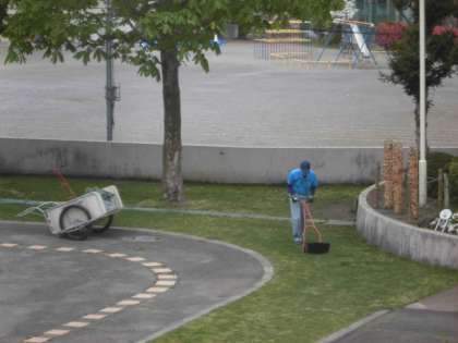 21日(木)、主事さんが上校庭の芝生の手入れをしてくださっていました。芝の高さがそろいました。
