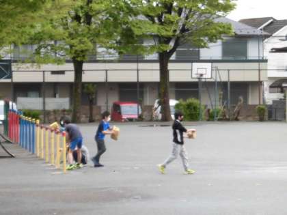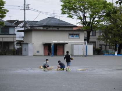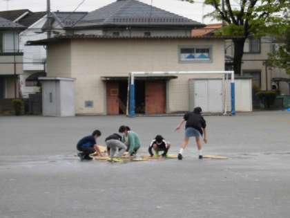 22日(金)の朝、校庭での様子です。前日夜から明け方まで降った雨の影響で、校庭にはいくつもの水溜りができていました。体育委員金曜日担当の5年生と6年生が大型スポンジを使って、水を吸い取る仕事をしていました。