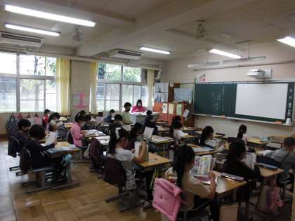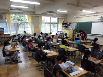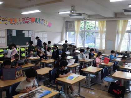 22日(金)の朝、1年生から4年生までは15分間の読書をして過ごします。1年生もページをめくりながら、絵本を手にしていました。