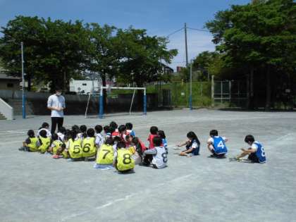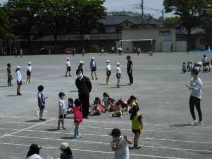 11日(水)の中休みの様子です。下校庭では、子供たちの遊び以外で3つの活動が同時進行していました。1・2年生によるリレーの練習です。リングバトンを受け取ったら「インコースを走る」、この練習をしました。校庭の中央では、応援団が立ち位置や入退場の確認をしました。