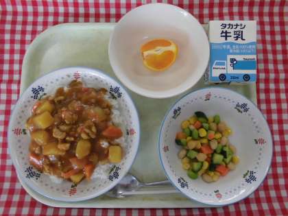 12日(木)の献立は、チキンカレーライス、ビーンズサラダ、くだもの(カラマンダリン)、牛乳です。
