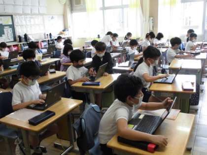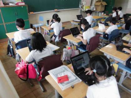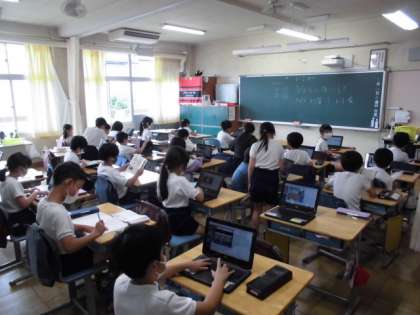 12日(木)の4時間目、3年2組はタブレット端末を使ってローマ字入力の練習をしました。入力を間違えずに行うと進級できるというものです。やり方を教えてあげる姿がありました。