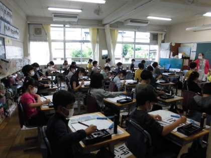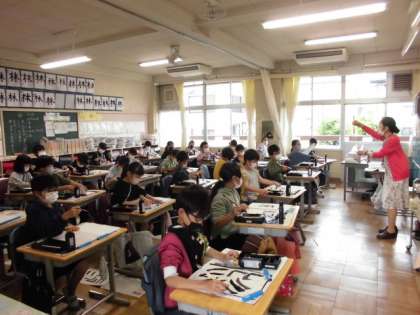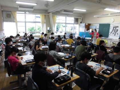 13日(金)の1・2時間目、4年1組は書写の時間でした。講師の先生との学習です。今回は毛筆で「原」と書きました。