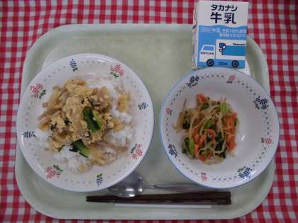 16日(月)の献立は、親子丼、ごまあえ、牛乳です。