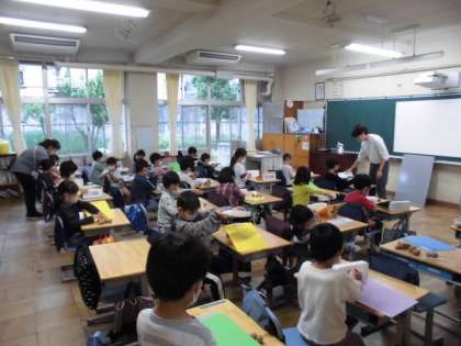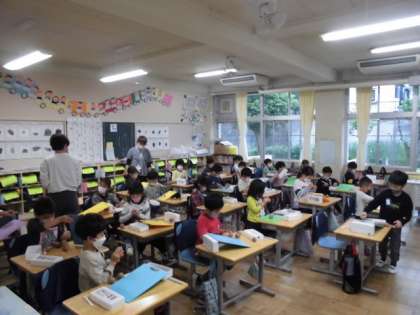 16日(月)の2時間目、1年2組も図画工作の時間でした。1組の担任が2組に入りました。粘土を丸めてお団子を作っていました。丸めた粘土を転がそうとする子供たちがいました。