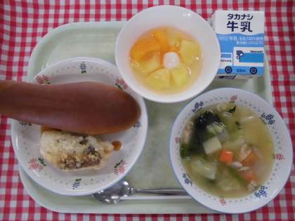 17日(火)の献立は、黒砂糖パン、レンズ豆と野菜のスープ、白身魚のレモンソースかけ、フルーツ白玉、牛乳です。