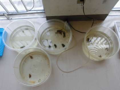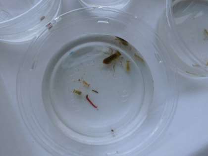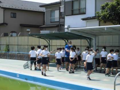 18日(水)の3時間目、3年1組はプールサイドにいました。班の代表が網でヤゴを取りました。2組は4時間目に行いました。確保したヤゴは、プレイルームにおきました。これから観察を続けていきます。