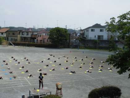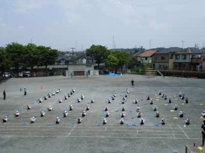 18日(水)の3・4時間目、5・6年生は団体演技の練習をしました。前日が雨だったため、その分も合わせて細かい点まで確認しながら完成度を高めていきました。写真は専科棟2階のベランダから撮りました。お子さんのいる場所をご確認ください。5年生は青色、6年生は黄色の旗です。