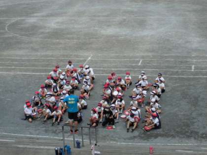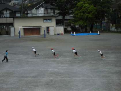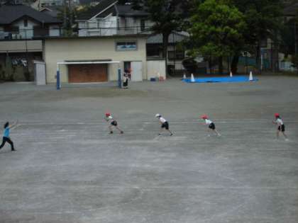 19日(木)の5時間目、3年生と4年生は「エイサー」の練習をしました。今回、初めて頭に紫色のマンサージを巻いて踊りました。写真は踊り終えた3年生の振り返りの様子、4年生の80m走の練習の様子です。