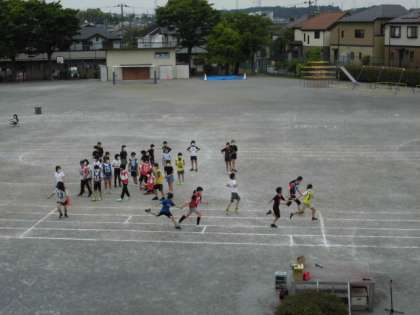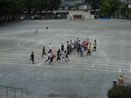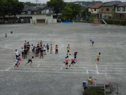 20日(金)、5年生と6年生のリハーサルのラストにリレーの練習をしました。写真は専科棟2階のベランダから撮影しました。上校庭の階段では、子供たちが拍手で応援をしていました。