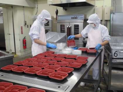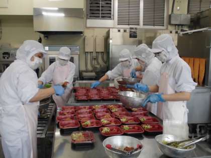 21日(土)の給食は、運動会に合わせてお弁当給食にしました。給食室で、それぞれのおかずを調理し、約350食分をつめました。子供たちはお弁当給食を喜んで食べていました。特に唐揚げが人気で「またお弁当給食がいい。」という声もありました。