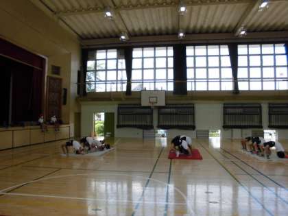5日(月)の5時間目、4年1組は体育の時間でした。器械運動に取り組んでいました。最初は、平均台の上を歩く練習です。次に、マットを出して「ブリッジ」に挑戦しました。