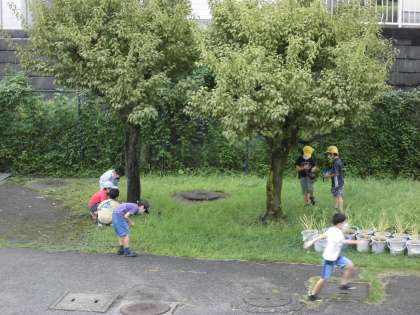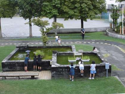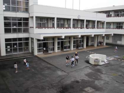 8日(木)の中休みの様子です。雨の影響により上校庭のみ使用可能となりました。池を眺めたり、一輪車に乗ったりして過ごしました。