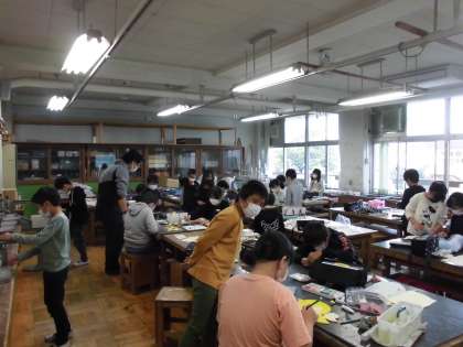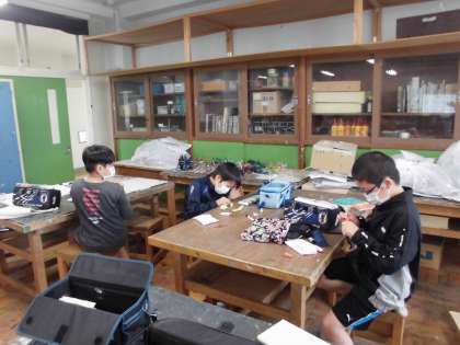 6日(木)の1・2時間目、5年2組は図画工作の時間でした。「ひみつのすみか」の制作に取り組んでいます。すみかの看板を電動糸のこで切ったり、住人やすみかに置きたいものを紙粘土で作ったりしました。