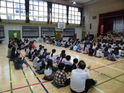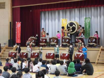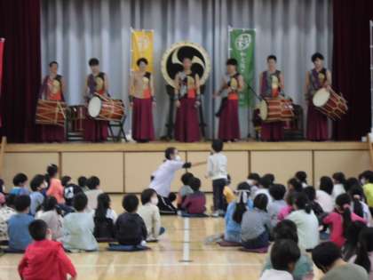 6日(木)の2時間目、1年生から3年生までが和太鼓公演に参加しました。演奏だけでなく、太鼓や太鼓以外の和楽器(チャッパや篠笛、能管)の紹介コーナーがありました。また、各クラスから2名が登場しての体験コーナーもありました。子供たちのアンコールにも応えていただき、子供たちは手拍子をしたり、体を動かしたりして楽しいひとときを過ごしました。