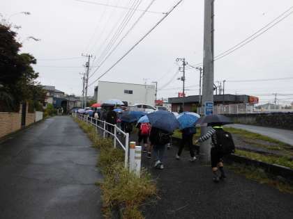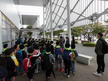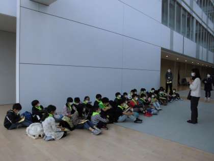 傘をさしての移動のため、特に交通安全に気をつけながら歩きました。午前9時25分、町田市庁舎に到着しました。担当の方々と挨拶をしてから、クラスごとに市庁舎内を案内していただきました。2組は最初に、3階ロビーで市庁舎の仕事について話を聞きました。