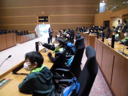 2組の子供たちが「動物村村長選挙」を体験しているころ、1組は町田市議会議場にいました。議員の椅子に座り、賛成か反対かのボタンを押して意思表示をする体験をしました。
