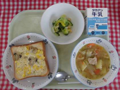 11日(火)の献立は、マヨネーズトースト、白菜と豆のサラダ、鶏肉のポトフ、牛乳です。