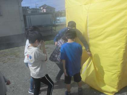 11日(火)の4時間目、3年生から5年生までの子供たちが「煙体験」をしました。これまでコロナ禍のため、体験できなかった子供たちです。最初は5年生でした。消防署の方から煙の中での避難の仕方を教えていただき、姿勢を低くしながらテントの中を歩きました。