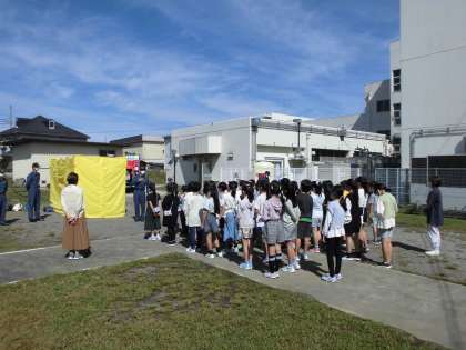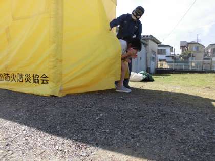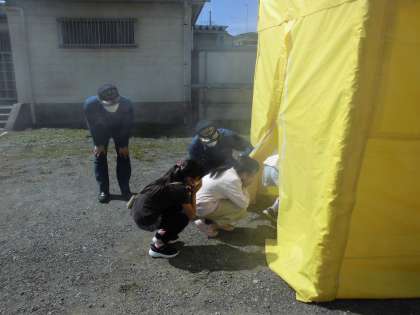 11日(火)の4時間目、5年生の次に4年生が煙体験しました。ハンカチを口に当て、姿勢を低くしてテント内を歩いて外に出ました。