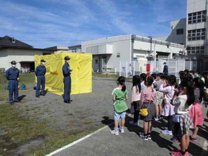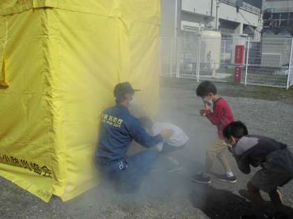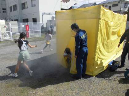 11日(火)、最後に3年生が煙体験を行いました。テントの中にたかれた煙は体への影響はありません。子供たちは順番にテントの中に入り、出てきたときは安心した表情をしていました。