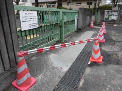 12日(水)朝の正門です。穴を空けたところにコンクリートを流しています。子供たちの登校が終わる頃、コーンやバーが取り除かれました。明日からは門を開けて子供たちを迎えることができます。