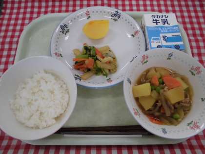 13日(木)の献立は、ご飯、肉じゃが、ごまあえ、くだもの(かき)、牛乳です。
