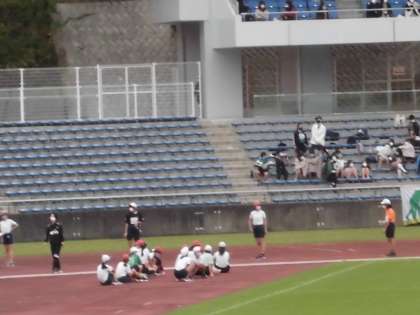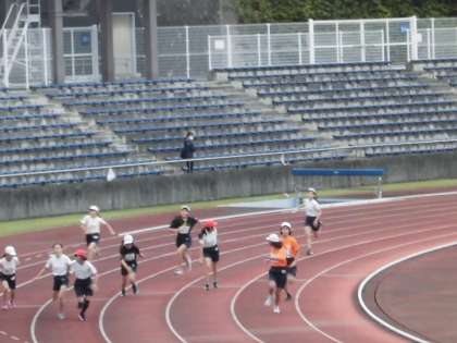 連合体育大会午後の部は、午後1時から始まりました。チャレンジスポーツや800m走に本校の子供たちは参加しませんでしたが、拍手をしたり、走りをじっくり見たりすることができました。最後は、400mリレー走です。最初は女子の部でした。2コースから8コースまでを使用し、スタート前には学校名の紹介がありました。本校は第1レースに登場し、3コース(赤帽子)を力いっぱい走りました。