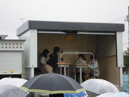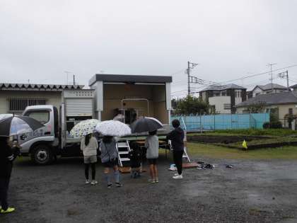 14日(金)3時間目の後半は、4年2組が起震車体験をしました。小雨が降り出してきたので、畑までは傘をさして移動しました。1組同様、説明を聞いてから始めました。子供たちは実際の揺れを体験して、地震の怖さと身を守る大切さを実感しました。