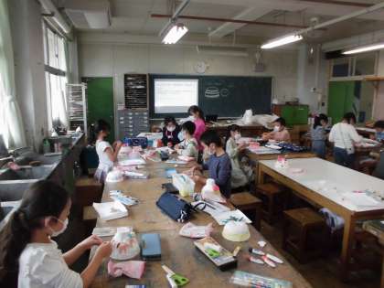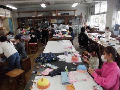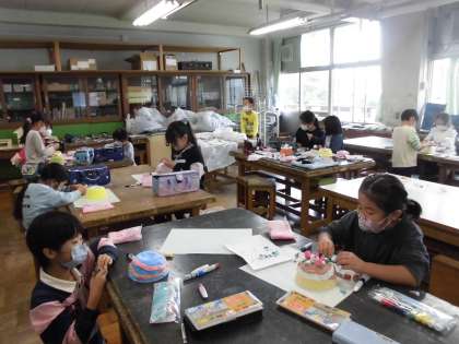 14日(金)の3・4時間目、2年1組は図画工作の時間でした。「ハッピーケーキのおくりもの」と題して、ケーキ作りに取り組んでいました。今回は、ケーキの土台づくりをしました。クリームをイメージした着色した紙粘土を容器の周りにつけました。そこにいちごやろうそくなどを足していきました。