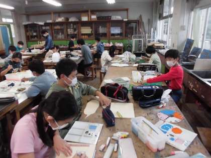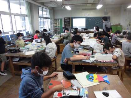 14日(金)の5・6時間目、5年1組は図画工作の時間でした。「ひみつのすみか」づくりに取り組んでいます。すみかの看板に着彩したり、すみかの住人を紙粘土で作ったりしました。
