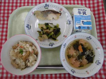 17日(月)の献立は、こぎつねご飯、たらの西京焼き、小松菜とちくわの煮物、そうめん入りすまし汁、牛乳です。