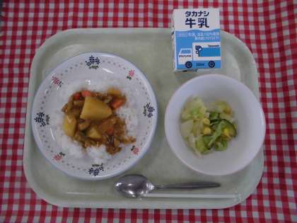 18日(火)の献立は、チキンカレーライス、コールスローサラダ、牛乳です。