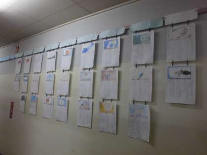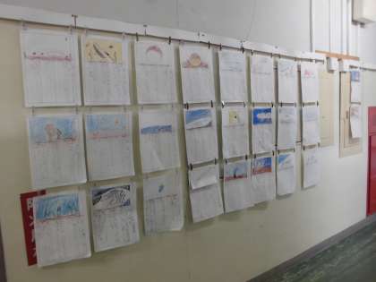 1年生の廊下に、国語の時間に調べた「うみのいきもの」が登場しました。生き物のよさが伝わるように項目ごとにまとめました。生き物の絵も図鑑やタブレット端末を見ながら描きました。